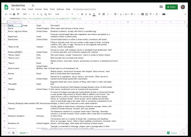 =IMPORTHTML(“https://en.wikipedia.org/wiki/List_of_sandwiches”, “table”, 1)
