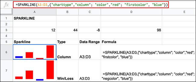 Bạn có thể tạo một biểu đồ nhỏ trong một ô duy nhất bằng hàm Sparkline tiện lợi của Sheets. Chỉ cần nhập lệnh = SPARKLINE, như công thức bên dưới: