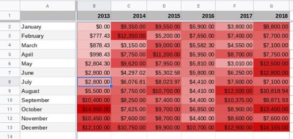 Tạo bản đồ nhiệt để đánh dấu các mức cao và thấp và giúp bạn dễ dàng xem những thứ như doanh số bán hàng hoặc mô hình thành công về lưu lượng truy cập web.