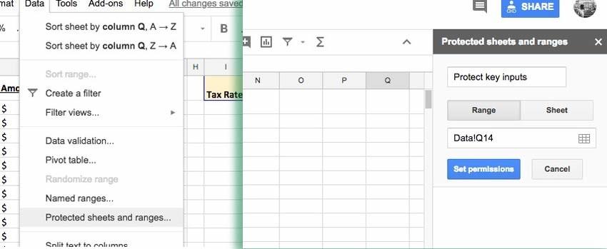 Bạn đi tới tùy chọn menu Data > Protected sheets and ranges. Một menu sẽ mở ra phía bên phải cho phép bạn chỉ cần nhấp và kéo qua dữ liệu cần được bảo vệ.