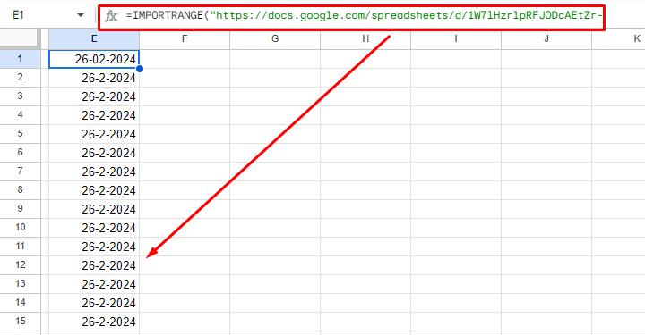 =IMPORTRANGE(“https://docs.google.com/spreadsheets/d/1aBcDEf”, “Sheet1!D1:D15”)